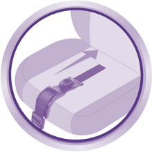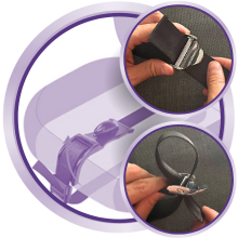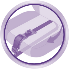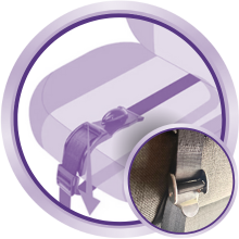 Pasa la correa por debajo del asiento y, a continuación, introdúcela por la ranura superior de la hebilla metálica, tal y como se indica en la imagen. Asegúrate de que no queden nudos ni torceduras.